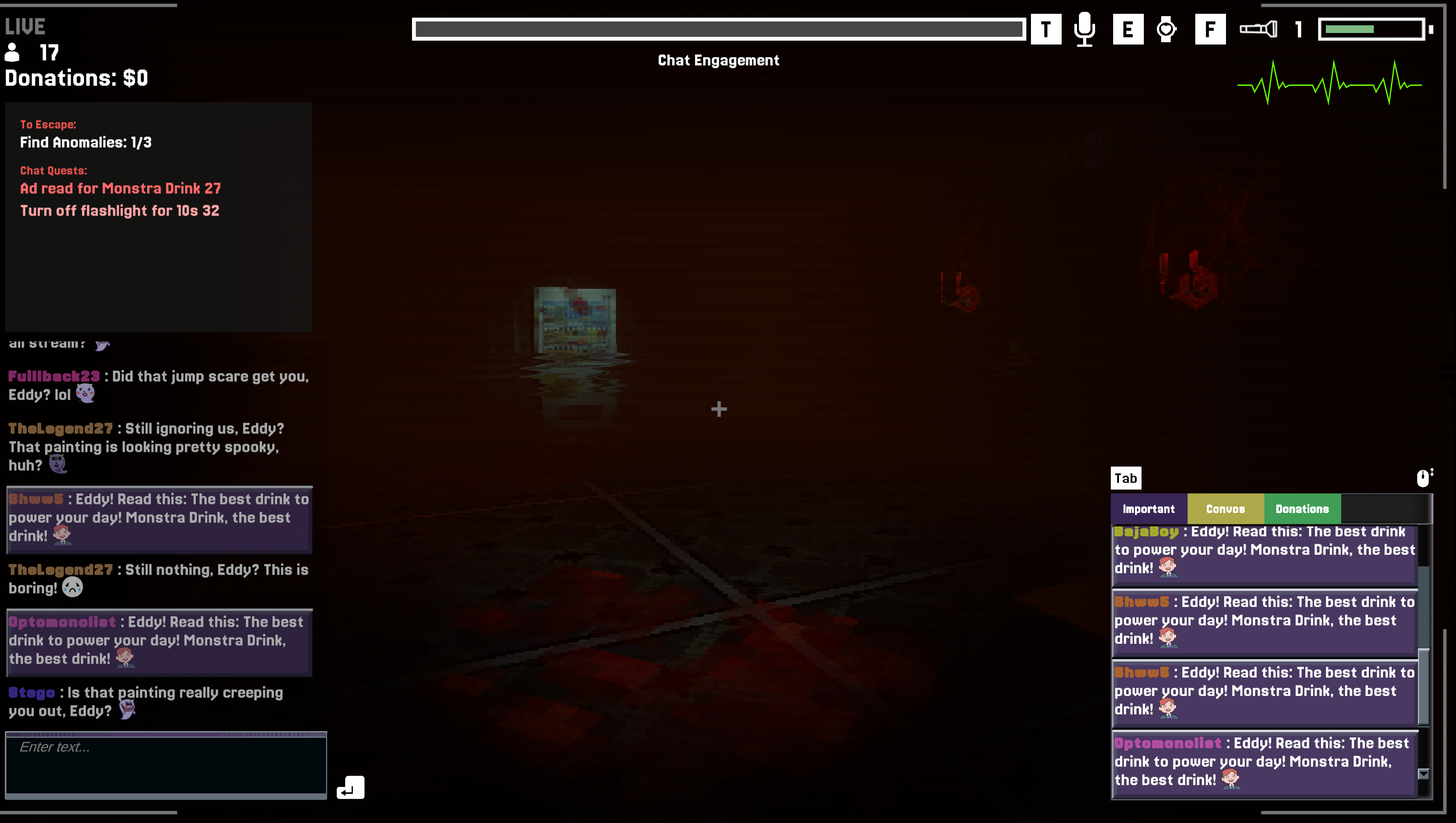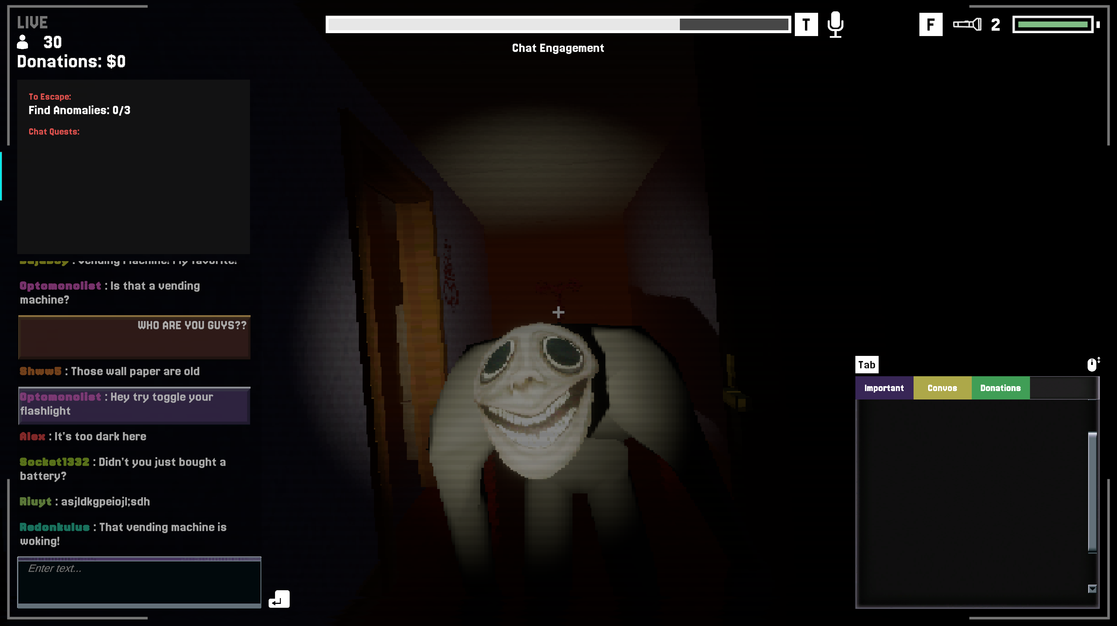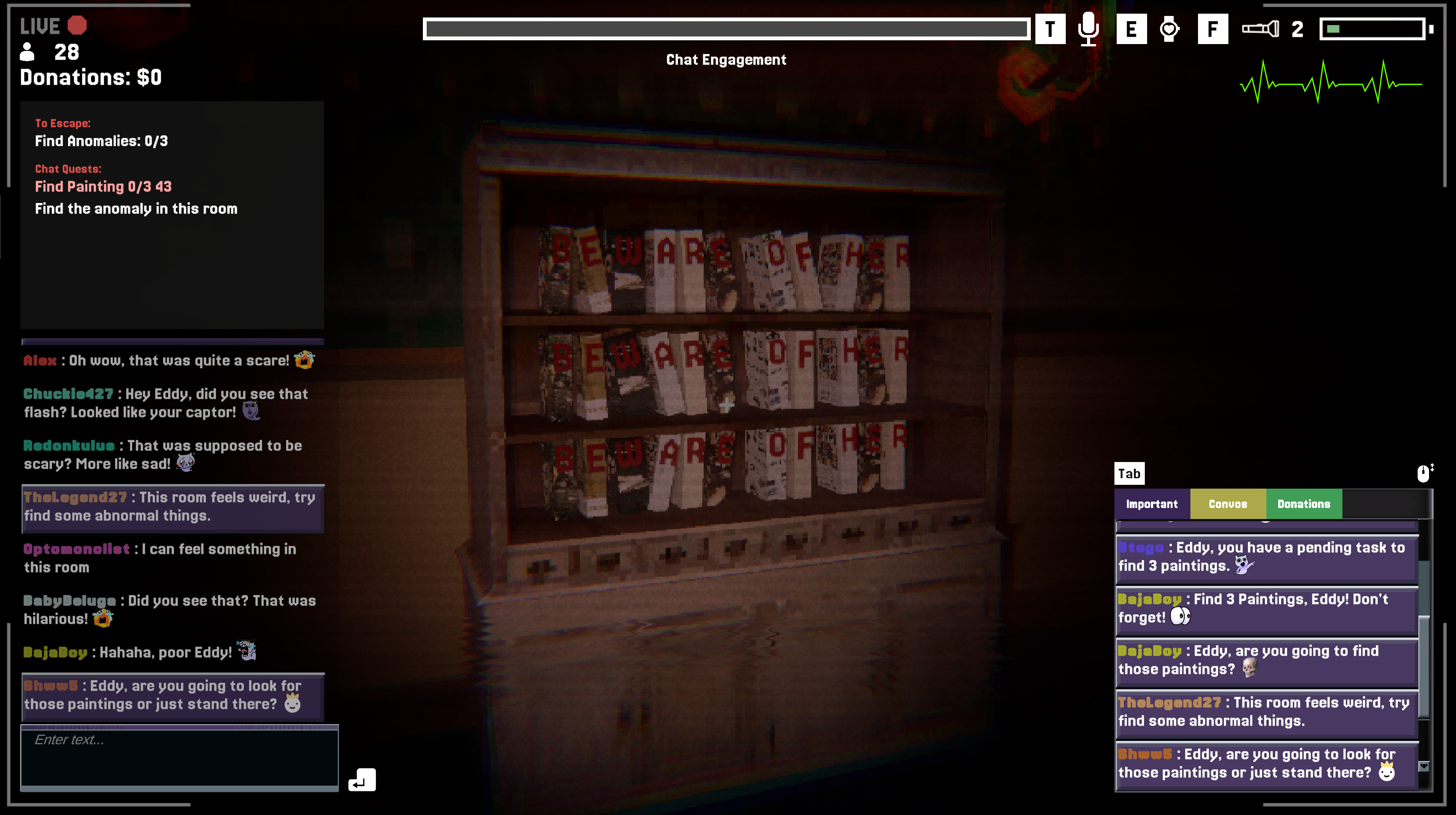 To address these issues, I pitched an idea based around what kinds of interactions would a streamer have with the audience while in a horror setting. The idea is to hide secrets that are barely detectable so that the player has to rely on the help of Chat to progress. The genre of anomaly finding game was the first to come to mind.